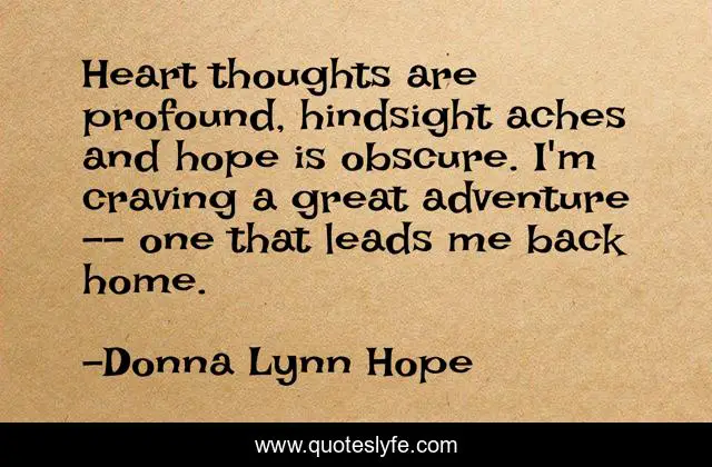 This page presents the quote "Heart thoughts are profound, hindsight aches and hope is obscure. I'm craving a great adventure -- one that leads me back home.". Author of this quote is Donna Lynn Hope. This quote is about home, homesickness, homesick,.