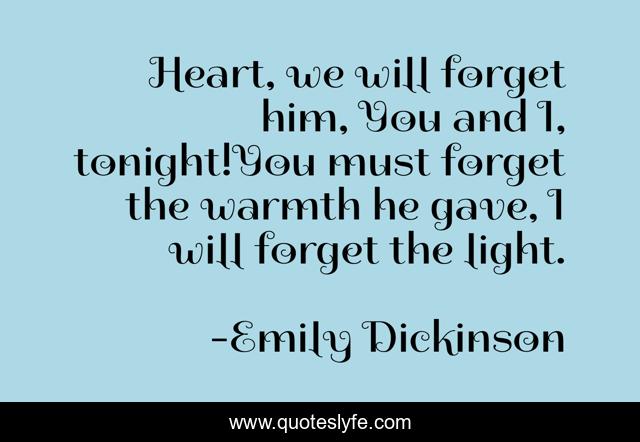 This page presents the quote "Heart, we will forget him, You and I, tonight!You must forget the warmth he gave, I will forget the light.". Author of this quote is Emily Dickinson. This quote is about love, affection,.