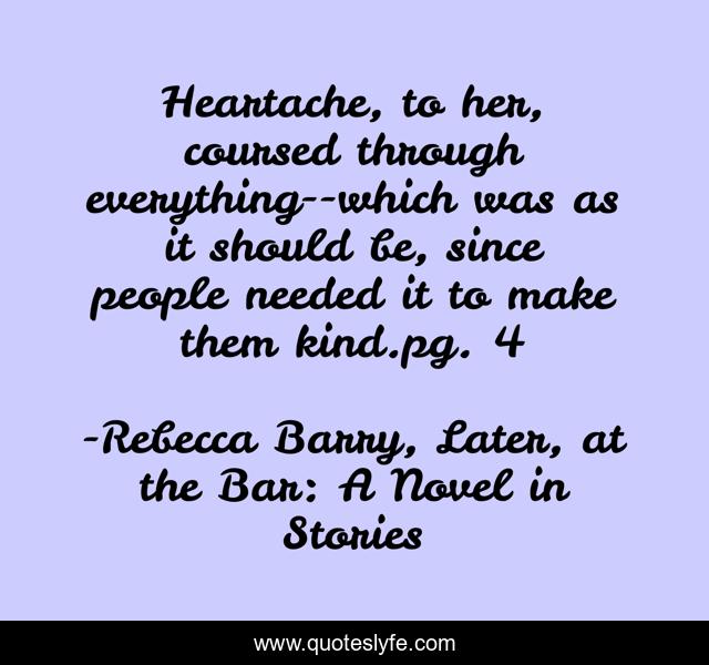 This page presents the quote "Heartache, to her, coursed through everything--which was as it should be, since people needed it to make them kind.pg. 4". Author of this quote is Rebecca Barry, Later, at the Bar: A Novel in Stories. .