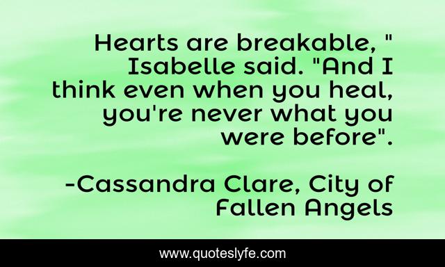 This page presents the quote "Hearts are breakable, " Isabelle said. "And I think even when you heal, you're never what you were before".". Author of this quote is Cassandra Clare, City of Fallen Angels. This quote is about love, broken-hearted, heartbreak, healing, inspirational, enthusiasm, affection,.