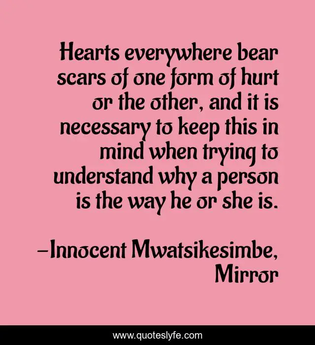 This page presents the quote "Hearts everywhere bear scars of one form of hurt or the other, and it is necessary to keep this in mind when trying to understand why a person is the way he or she is.". Author of this quote is Innocent Mwatsikesimbe, Mirror. This quote is about heart, life, love, relationship, people, affection,.