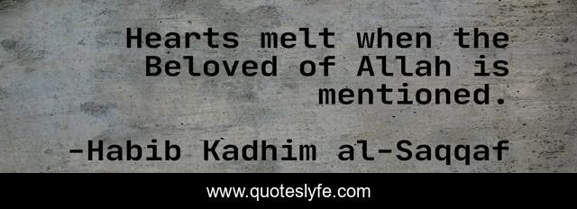 This page presents the quote "Hearts melt when the Beloved of Allah is mentioned.". Author of this quote is Habib Kadhim al-Saqqaf. This quote is about love, god, allah, prophet-muhammad, hearts, affection, islam,.