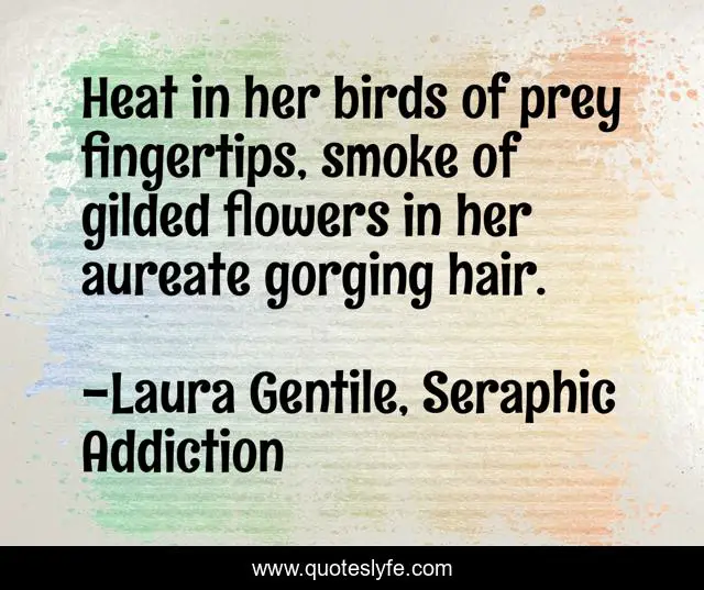 This page presents the quote "Heat in her birds of prey fingertips, smoke of gilded flowers in her aureate gorging hair.". Author of this quote is Laura Gentile, Seraphic Addiction. This quote is about hair, heat, flowers, birds, smoke,.
