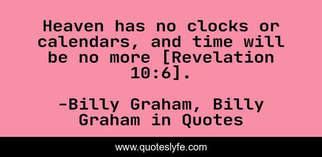 This page presents the quote "Heaven has no clocks or calendars, and time will be no more [Revelation 10:6].". Author of this quote is Billy Graham, Billy Graham in Quotes. This quote is about billy-graham, time,.
