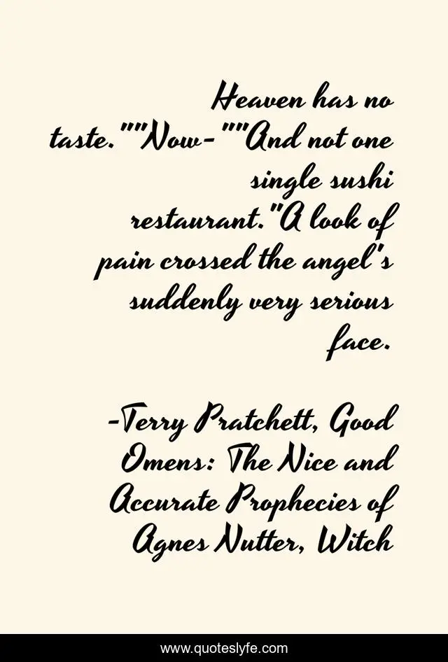 "Terry Pratchett, Good Omens: The Nice and Accurate Prophecies of Agnes Nutter, Witch Quotes." Quoteslyfe.com, 2025. Fri. 05 Dec. 2025. <https://www.quoteslyfe.com/quote/Heaven-has-no-taste-Now-And-not-183395>.
