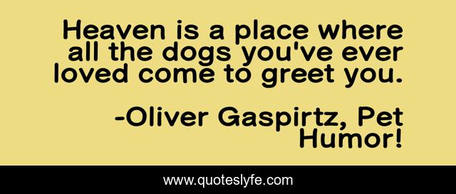 This page presents the quote "Heaven is a place where all the dogs you've ever loved come to greet you.". Author of this quote is Oliver Gaspirtz, Pet Humor!. This quote is about faith, death, love, solace, comfort, grief-and-loss, grief, life-after-death, heaven,.