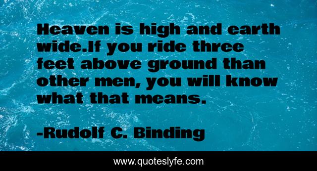 This page presents the quote "Heaven is high and earth wide.If you ride three feet above ground than other men, you will know what that means.". Author of this quote is Rudolf C. Binding. This quote is about horseback-riding, animals,.