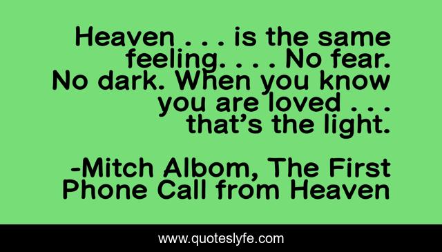 This page presents the quote "Heaven . . . is the same feeling. . . . No fear. No dark. When you know you are loved . . . that’s the light.". Author of this quote is Mitch Albom, The First Phone Call from Heaven. This quote is about faith, heaven, love, light, inspirational, enthusiasm, fear, affection,.