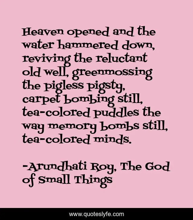 "Arundhati Roy, The God of Small Things Quotes." Quoteslyfe.com, 2025. Mon. 08 Dec. 2025. <https://www.quoteslyfe.com/quote/Heaven-opened-and-the-water-hammered-down-234564>.