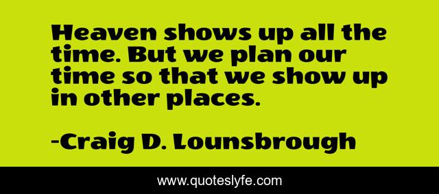 This page presents the quote "Heaven shows up all the time. But we plan our time so that we show up in other places.". Author of this quote is Craig D. Lounsbrough. This quote is about reveal, arrives, join, revealed, destination, encounter, see, engage, location,.