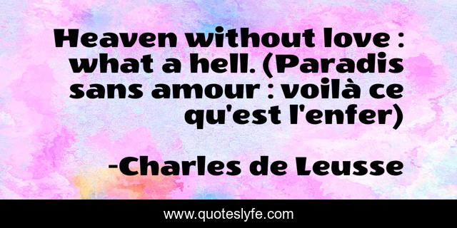 This page presents the quote "Heaven without love : what a hell. (Paradis sans amour : voilà ce qu'est l'enfer)". Author of this quote is Charles de Leusse. This quote is about heaven, love, enfer, hell, amour, paradis, affection,.