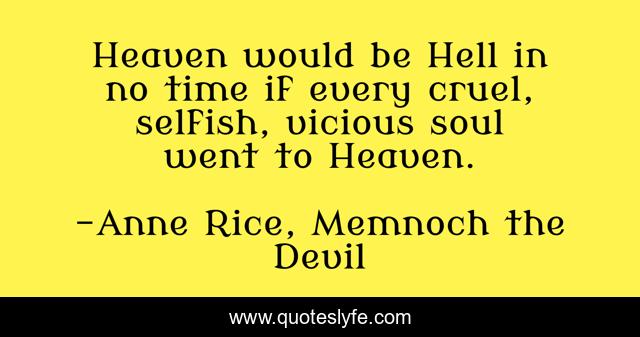 This page presents the quote "Heaven would be Hell in no time if every cruel, selfish, vicious soul went to Heaven.". Author of this quote is Anne Rice, Memnoch the Devil. This quote is about hell, heaven,.