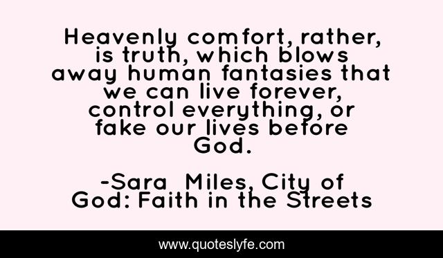 This page presents the quote "Heavenly comfort, rather, is truth, which blows away human fantasies that we can live forever, control everything, or fake our lives before God.". Author of this quote is Sara Miles, City of God: Faith in the Streets. This quote is about god, comfort,.