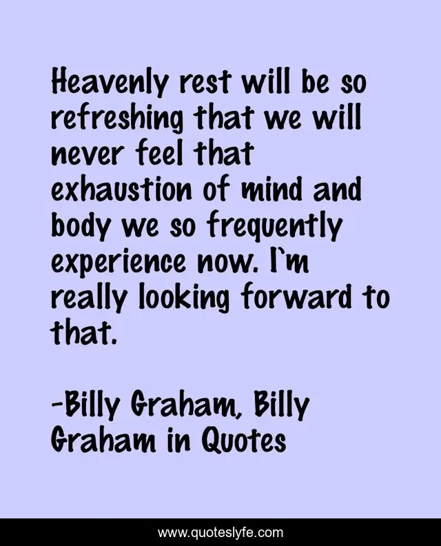 "Billy Graham, Billy Graham in Quotes Quotes." Quoteslyfe.com, 2025. Fri. 05 Dec. 2025. <https://www.quoteslyfe.com/quote/Heavenly-rest-will-be-so-refreshing-that-152446>.