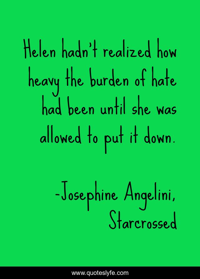 This page presents the quote "Helen hadn't realized how heavy the burden of hate had been until she was allowed to put it down.". Author of this quote is Josephine Angelini, Starcrossed. .
