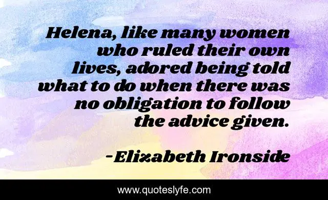 This page presents the quote "Helena, like many women who ruled their own lives, adored being told what to do when there was no obligation to follow the advice given.". Author of this quote is Elizabeth Ironside. This quote is about authority, women,.