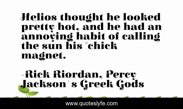 This page presents the quote "Helios thought he looked pretty hot, and he had an annoying habit of calling the sun his "chick magnet.". Author of this quote is Rick Riordan, Percy Jackson's Greek Gods. This quote is about humor, mythology, percy-jackson,.