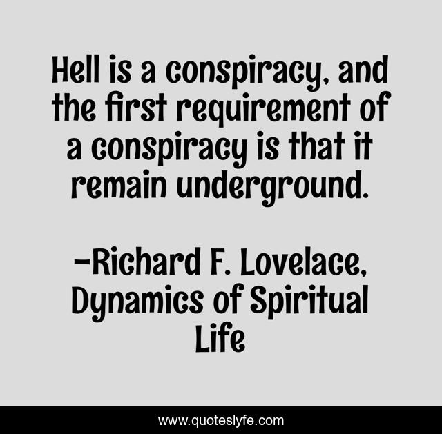 This page presents the quote "Hell is a conspiracy, and the first requirement of a conspiracy is that it remain underground.". Author of this quote is Richard F. Lovelace, Dynamics of Spiritual Life. .