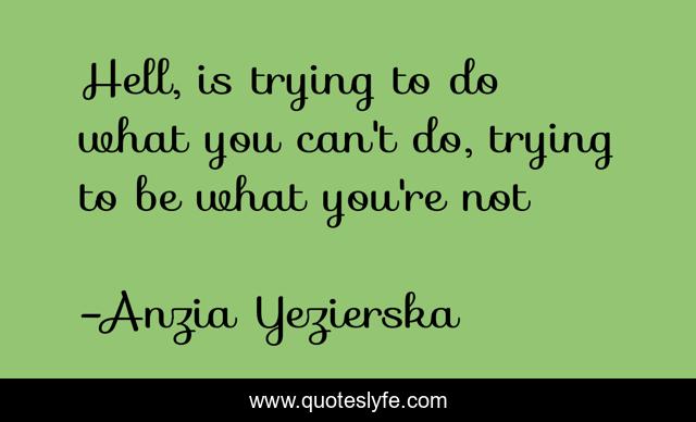 This page presents the quote "Hell, is trying to do what you can't do, trying to be what you're not". Author of this quote is Anzia Yezierska. This quote is about life, truth, being, not-staying-true, pretending, hell, identity,.