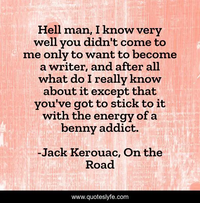 This page presents the quote "Hell man, I know very well you didn't come to me only to want to become a writer, and after all what do I really know about it except that you've got to stick to it with the energy of a benny addict.". Author of this quote is Jack Kerouac, On the Road. .