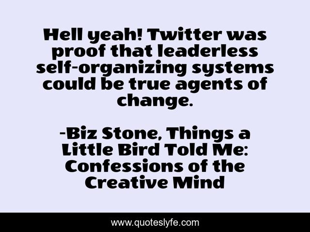 "Biz Stone, Things a Little Bird Told Me: Confessions of the Creative Mind Quotes." Quoteslyfe.com, 2025. Sat. 06 Dec. 2025. <https://www.quoteslyfe.com/quote/Hell-yeah-Twitter-was-proof-that-leaderless-60343>.