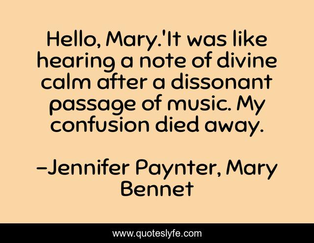 This page presents the quote "Hello, Mary.'It was like hearing a note of divine calm after a dissonant passage of music. My confusion died away.". Author of this quote is Jennifer Paynter, Mary Bennet. This quote is about realisation, cute, love, jennifer-paynter, mary-bennet, peter-bushell, jane-austen, pride-and-prejudice, innocent,.