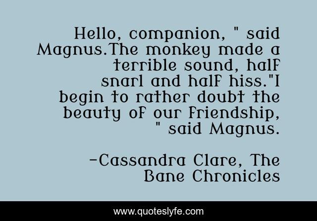 This page presents the quote "Hello, companion, " said Magnus.The monkey made a terrible sound, half snarl and half hiss."I begin to rather doubt the beauty of our friendship, " said Magnus.". Author of this quote is Cassandra Clare, The Bane Chronicles. This quote is about magnus-bane, friendship, monkey,.
