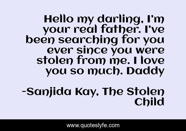 This page presents the quote "Hello my darling, I’m your real father. I’ve been searching for you ever since you were stolen from me. I love you so much. Daddy". Author of this quote is Sanjida Kay, The Stolen Child. This quote is about sanjida-kay, the-stolen-child, atlantic-books, crime, suspense, psychological-thriller, thriller,.