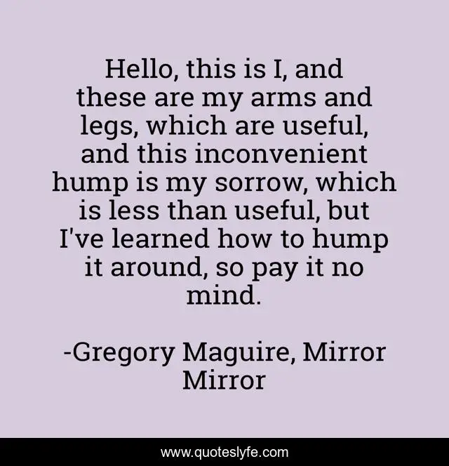 This page presents the quote "Hello, this is I, and these are my arms and legs, which are useful, and this inconvenient hump is my sorrow, which is less than useful, but I've learned how to hump it around, so pay it no mind.". Author of this quote is Gregory Maguire, Mirror Mirror. This quote is about grief, sorrow,.