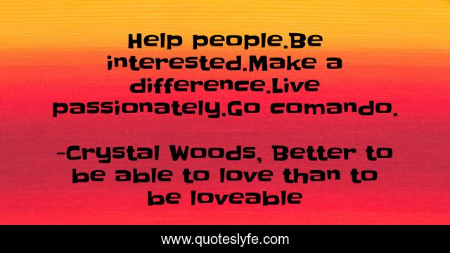 This page presents the quote "Help people.Be interested.Make a difference.Live passionately.Go comando.". Author of this quote is Crystal Woods, Better to be able to love than to be loveable. This quote is about poem, life, humor, help, compassion, passion, make-a-difference, interest, commando,.