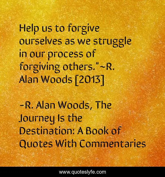 This page presents the quote "Help us to forgive ourselves as we struggle in our process of forgiving others."~R. Alan Woods [2013]". Author of this quote is R. Alan Woods, The Journey Is the Destination: A Book of Quotes With Commentaries. This quote is about forgiveness, processes, grace-of-god, r-alan-woods,.