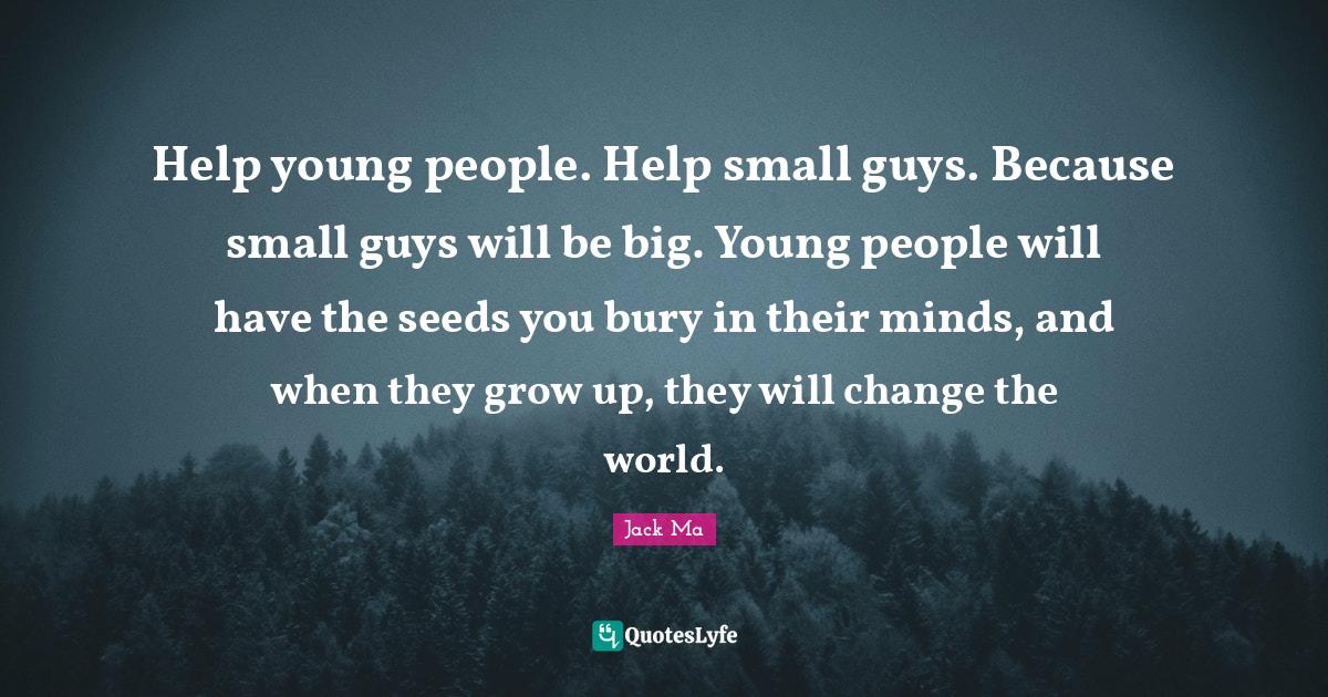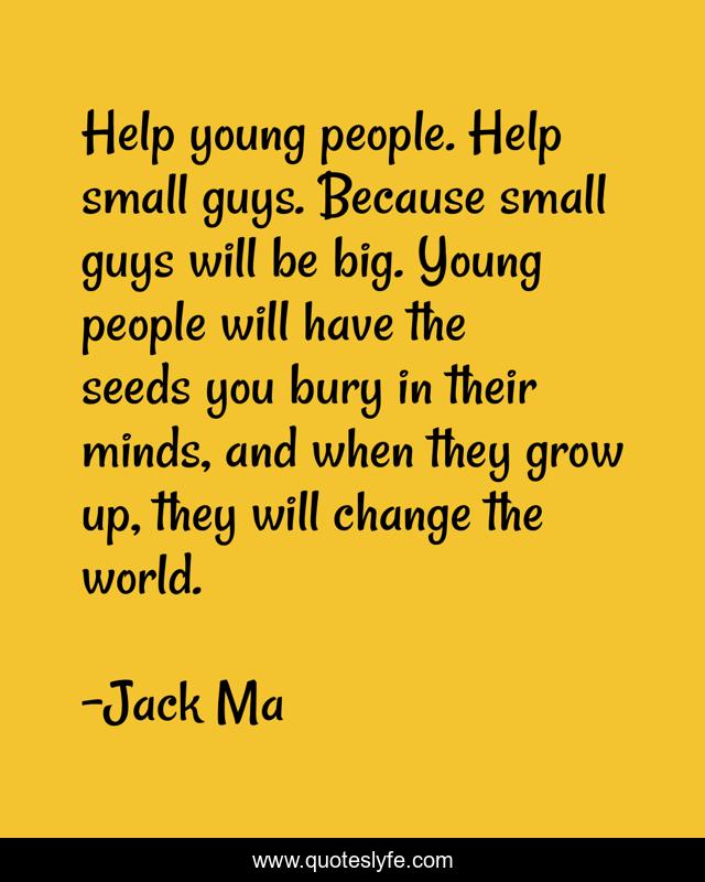 This page presents the quote "Help young people. Help small guys. Because small guys will be big. Young people will have the seeds you bury in their minds, and when they grow up, they will change the world.". Author of this quote is Jack Ma. This quote is about world, change the world,.