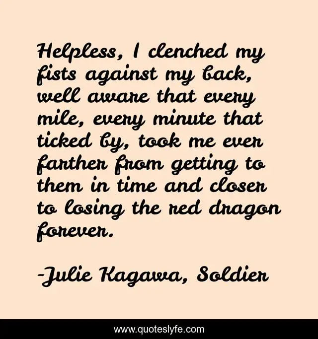 This page presents the quote "Helpless, I clenched my fists against my back, well aware that every mile, every minute that ticked by, took me ever farther from getting to them in time and closer to losing the red dragon forever.". Author of this quote is Julie Kagawa, Soldier. This quote is about dragon-slayers, love-triangle, urban-fantasy, dragons,.