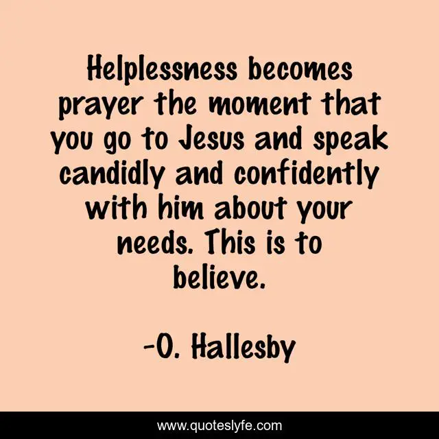 This page presents the quote "Helplessness becomes prayer the moment that you go to Jesus and speak candidly and confidently with him about your needs. This is to believe.". Author of this quote is O. Hallesby. .