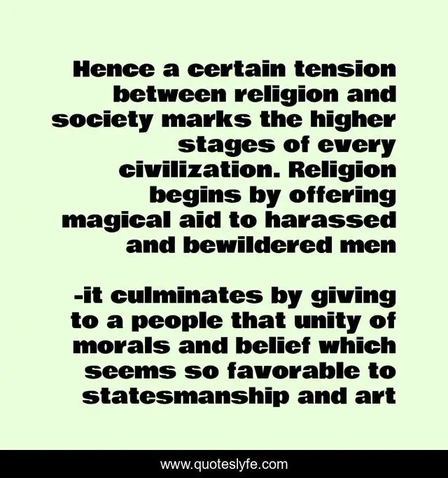 "it culminates by giving to a people that unity of morals and belief which seems so favorable to statesmanship and art Quotes." Quoteslyfe.com, 2025. Sun. 07 Dec. 2025. <https://www.quoteslyfe.com/quote/Hence-a-certain-tension-between-religion-and-239735>.