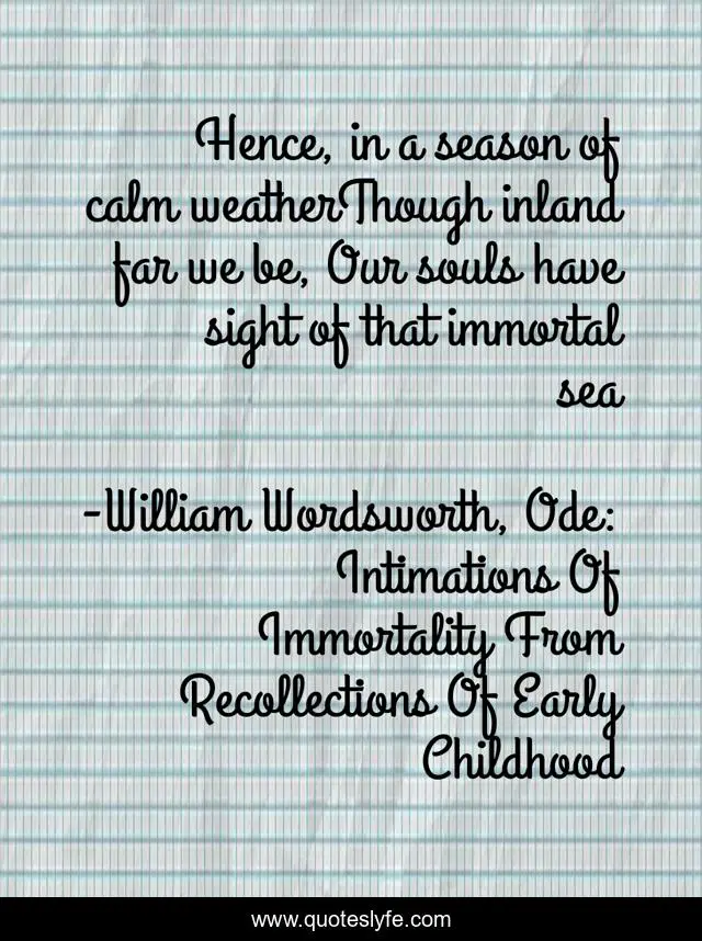 This page presents the quote "Hence, in a season of calm weatherThough inland far we be, Our souls have sight of that immortal sea". Author of this quote is William Wordsworth, Ode: Intimations Of Immortality From Recollections Of Early Childhood. This quote is about mortality, sea, souls,.