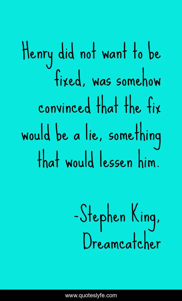 This page presents the quote "Henry did not want to be fixed, was somehow convinced that the fix would be a lie, something that would lessen him.". Author of this quote is Stephen King, Dreamcatcher. .