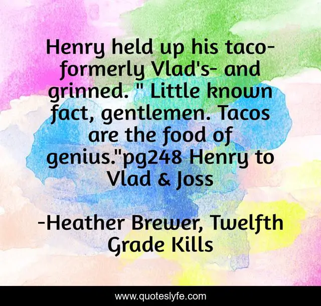 This page presents the quote "Henry held up his taco- formerly Vlad's- and grinned. " Little known fact, gentlemen. Tacos are the food of genius."pg248 Henry to Vlad & Joss". Author of this quote is Heather Brewer, Twelfth Grade Kills. This quote is about vlad, humor, joss, vampire, tacos, genius, henry,.