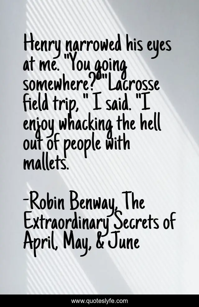 This page presents the quote "Henry narrowed his eyes at me. "You going somewhere?""Lacrosse field trip, " I said. "I enjoy whacking the hell out of people with mallets.". Author of this quote is Robin Benway, The Extraordinary Secrets of April, May, & June. This quote is about funny, comedy, laughed,.