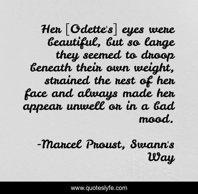 "Marcel Proust, Swann's Way Quotes." Quoteslyfe.com, 2025. Sat. 06 Dec. 2025. <https://www.quoteslyfe.com/quote/Her-Odette-s-eyes-were-beautiful-but-165531>.
