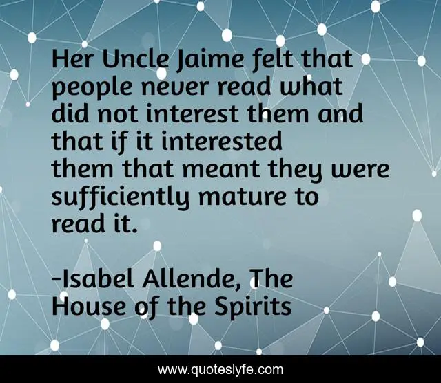 This page presents the quote "Her Uncle Jaime felt that people never read what did not interest them and that if it interested them that meant they were sufficiently mature to read it.". Author of this quote is Isabel Allende, The House of the Spirits. This quote is about intellectual-freedom, books, freadom, reading,.