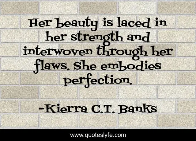 This page presents the quote "Her beauty is laced in her strength and interwoven through her flaws. She embodies perfection.". Author of this quote is Kierra C.T. Banks. This quote is about image, esteem, qoutes-to-live-by, self-love, strength, strength-of-character, womanhood, character, woman-s-character,.