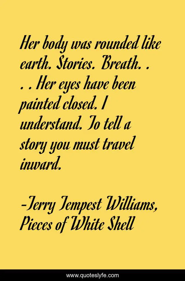 This page presents the quote "Her body was rounded like earth. Stories. Breath. . . . Her eyes have been painted closed. I understand. To tell a story you must travel inward.". Author of this quote is Terry Tempest Williams, Pieces of White Shell. .
