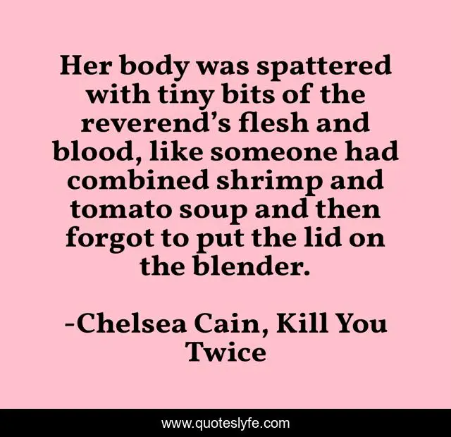 This page presents the quote "Her body was spattered with tiny bits of the reverend’s flesh and blood, like someone had combined shrimp and tomato soup and then forgot to put the lid on the blender.". Author of this quote is Chelsea Cain, Kill You Twice. This quote is about suspense, journalists, serial-killers,.