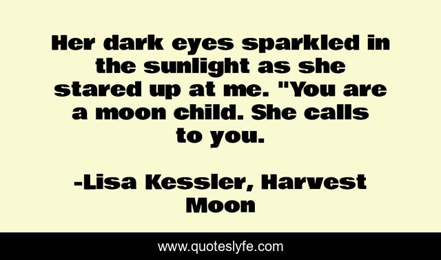 This page presents the quote "Her dark eyes sparkled in the sunlight as she stared up at me. "You are a moon child. She calls to you.". Author of this quote is Lisa Kessler, Harvest Moon. This quote is about wolf-shifters, hawaii, paranormal-romance, wolf-pack,.