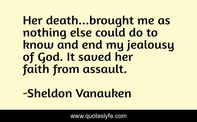 This page presents the quote "Her death...brought me as nothing else could do to know and end my jealousy of God. It saved her faith from assault.". Author of this quote is Sheldon Vanauken. This quote is about faith, grieving, death, christianity,.