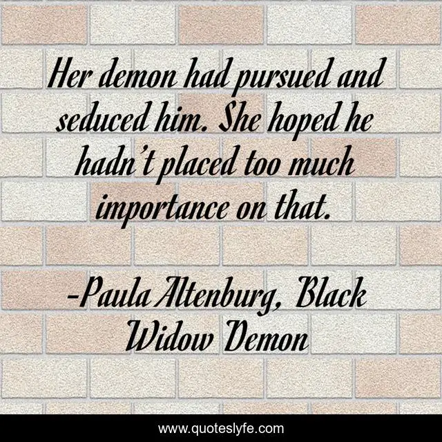 This page presents the quote "Her demon had pursued and seduced him. She hoped he hadn’t placed too much importance on that.". Author of this quote is Paula Altenburg, Black Widow Demon. This quote is about fantasy-romance, dystopia, western-romance, demons,.