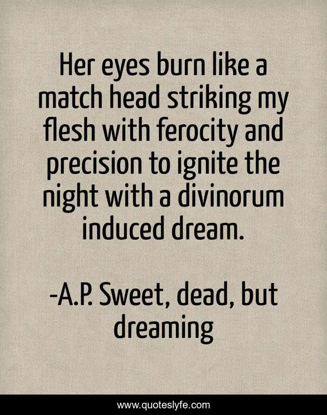 This page presents the quote "Her eyes burn like a match head striking my flesh with ferocity and precision to ignite the night with a divinorum induced dream.". Author of this quote is A.P. Sweet, dead, but dreaming. This quote is about ignite, eyes, flesh, fire, dream, match,.