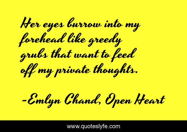 This page presents the quote "Her eyes burrow into my forehead like greedy grubs that want to feed off my private thoughts.". Author of this quote is Emlyn Chand, Open Heart. This quote is about thinking, farsighted, ya, emlyn-chand, young-adult, open-heart, metaphors,.