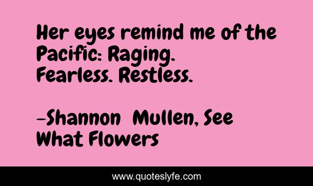 This page presents the quote "Her eyes remind me of the Pacific: Raging. Fearless. Restless.". Author of this quote is Shannon Mullen, See What Flowers. This quote is about fearlessness, eyes, restlessness, beauty, fearless, bipolar, mania, wild,.